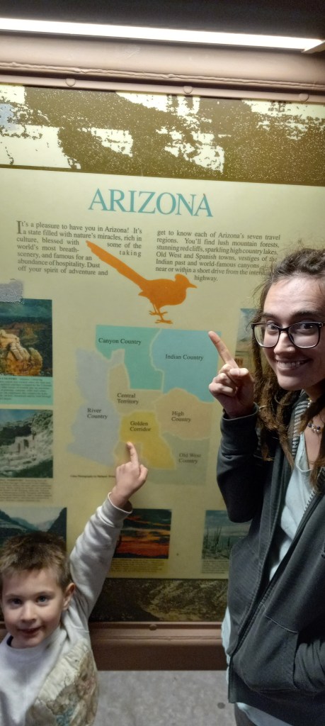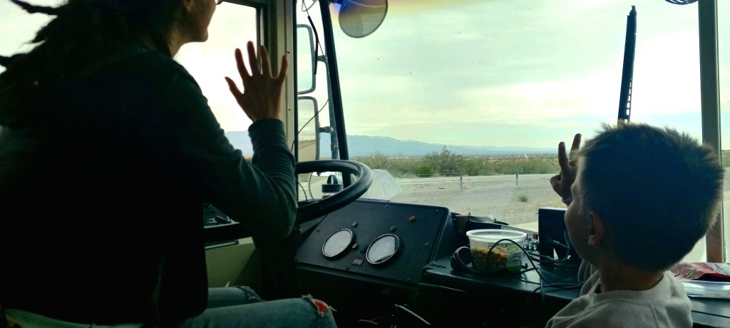 Shortly after we were in New Mexico, which was rather confusing for Braydon as we were not allowed to go to Mexico because we didn’t have passports, but it was OK to go to New Mexico! We stopped at a Camping World that was posted on the iOverlander app as having a free water spiket in their parking lot and filled our fresh water tank before we continued through the desert. We also stopped at a travel center for fuel and a post card for our first fuel-tank sponsor! (Over on our Sponsorship Page you can join us on our trip on a more personal level.)
