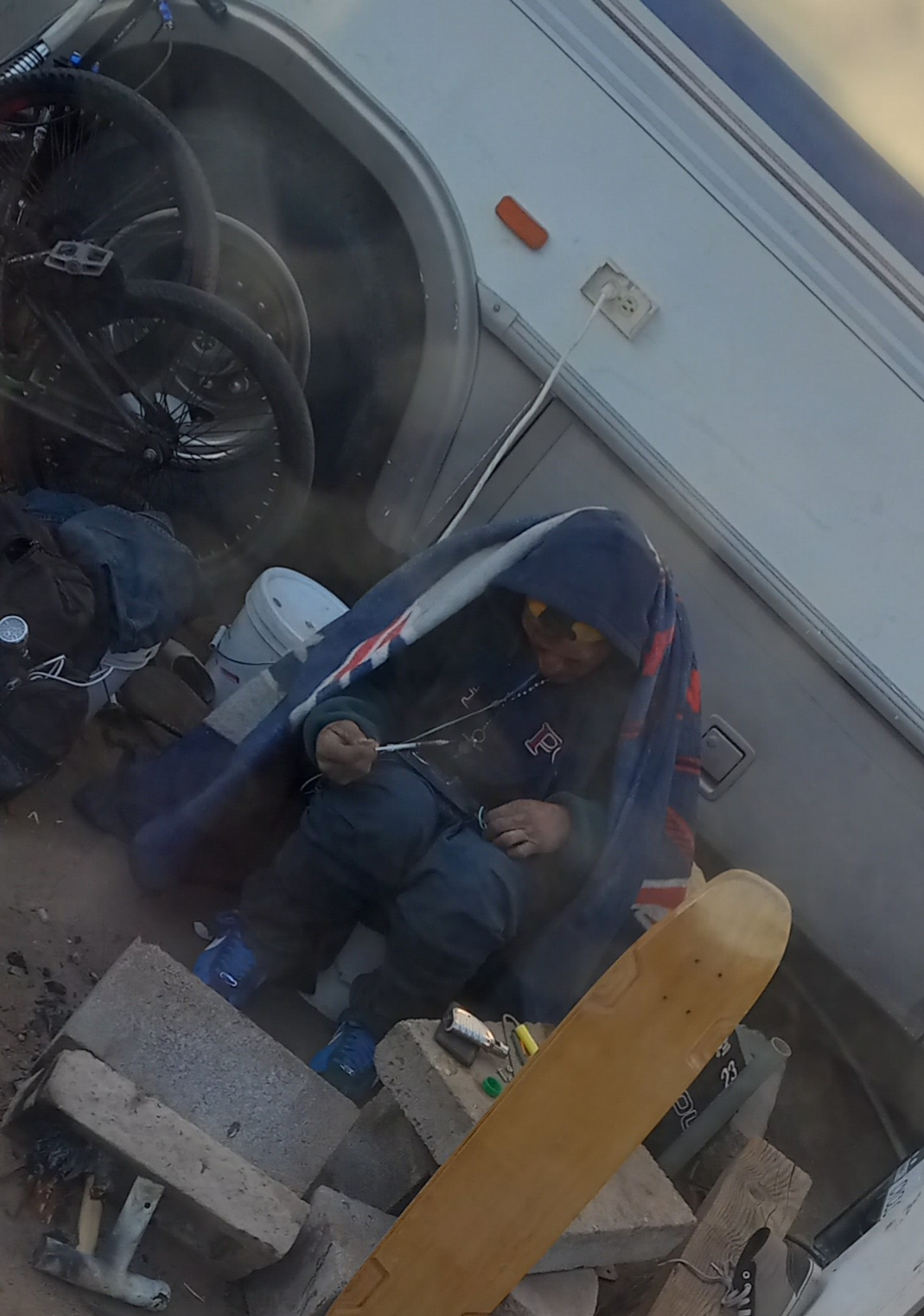 The people there were very interesting – they had their urban survival skills down pat! One night, over one of numerous trash fires outside our window, a group of people were toasting some frozen waffles and passing around a half-gallon of chocolate milk. It was a sight! Another time, they had put a bunch of broken cinder block pieces in a circle and put a big fire in it. There were several pallets around it as a shelter and an extra nearby that was being broken up as the fuel for the fire. Every hour or so each night we would be woken up to the sound of someone beating something: once a piece of steel was being heated over a trash fire and beat with a chunk of cinder block into a fender for one of their stolen bikes (which eventually became too difficult and was left around for someone else’s purpose and became their waffle griddle over another trash fire another night), usually there were pallets being broken up by being bashed on the ground to feed the fires. The neighbors were relatively bipolar in their tolerance for these intruders and would be sitting and getting high with them in their rv one night and then come storming out their front door screaming at everyone to vacate their property because all they are doing was “smoking dope” at 3 am another night. But interestingly enough, the dealer was always allowed to stay because “he pays the bills”.