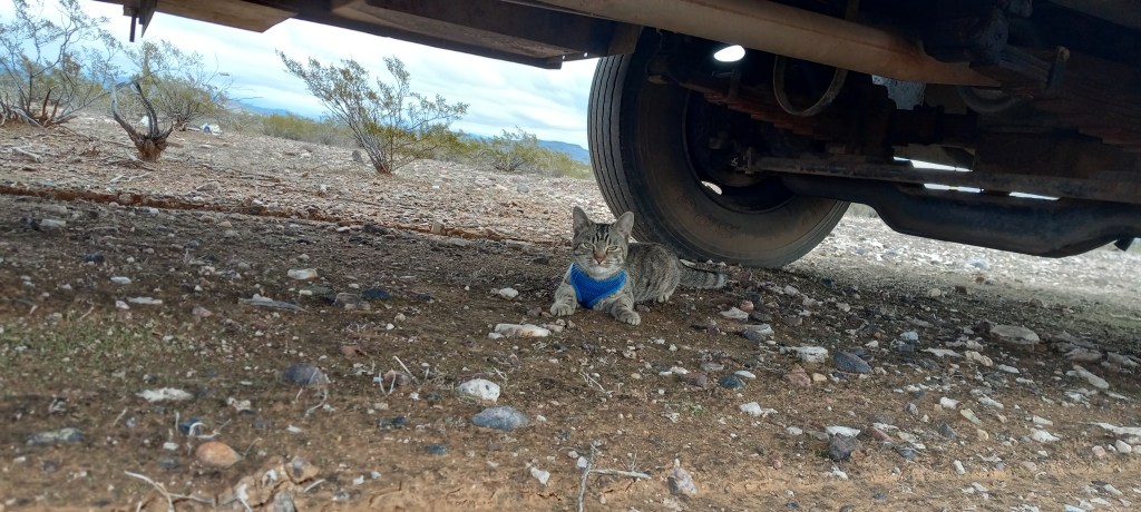 Even Sue has been enjoying going outside! Though she keeps to under the bus mostly, she has taken to using the drive shaft of the bus as her tightrope and practicing her high wire acrobatics. We added a bell to her harness so we could find her easier. Scarlett’s collar came with a bell, so now they both jingle as they run around the desert.