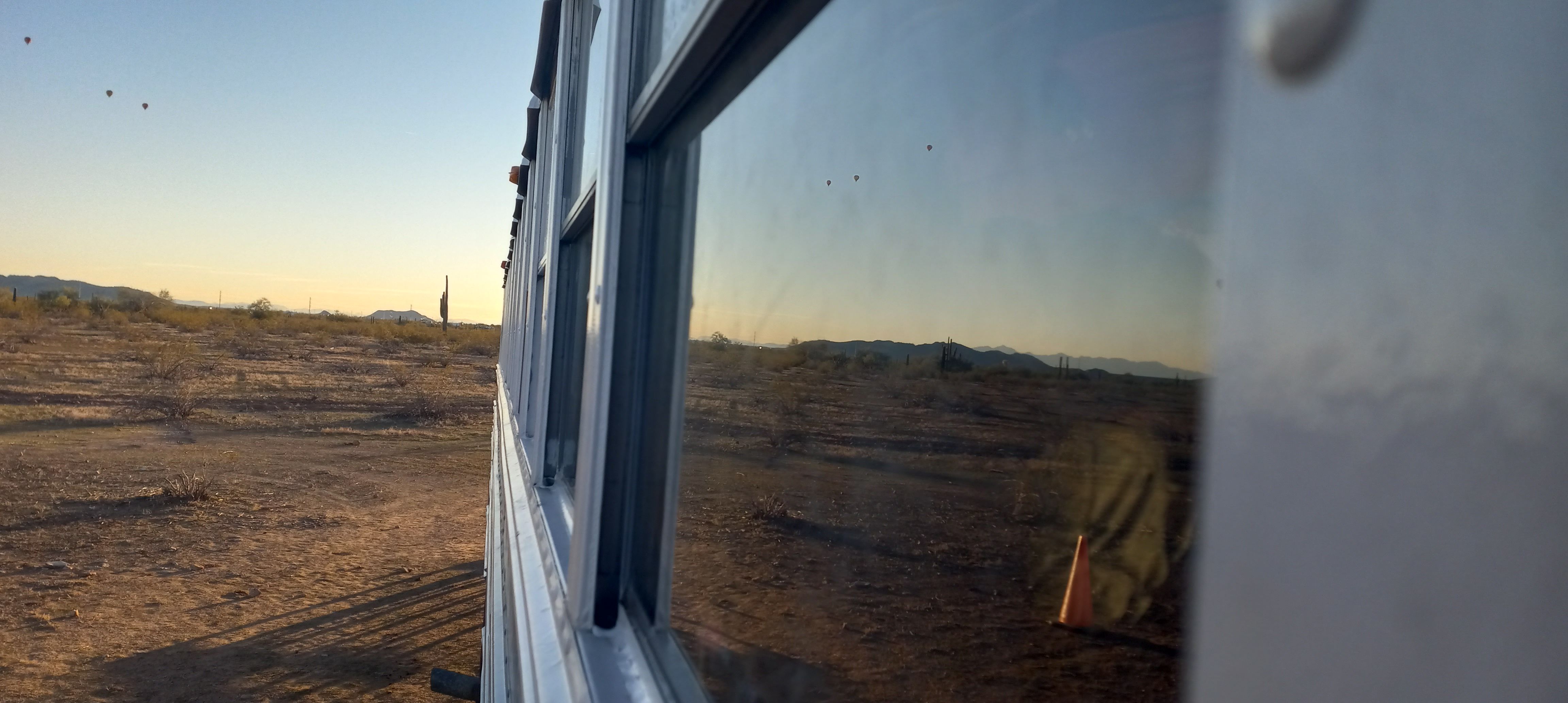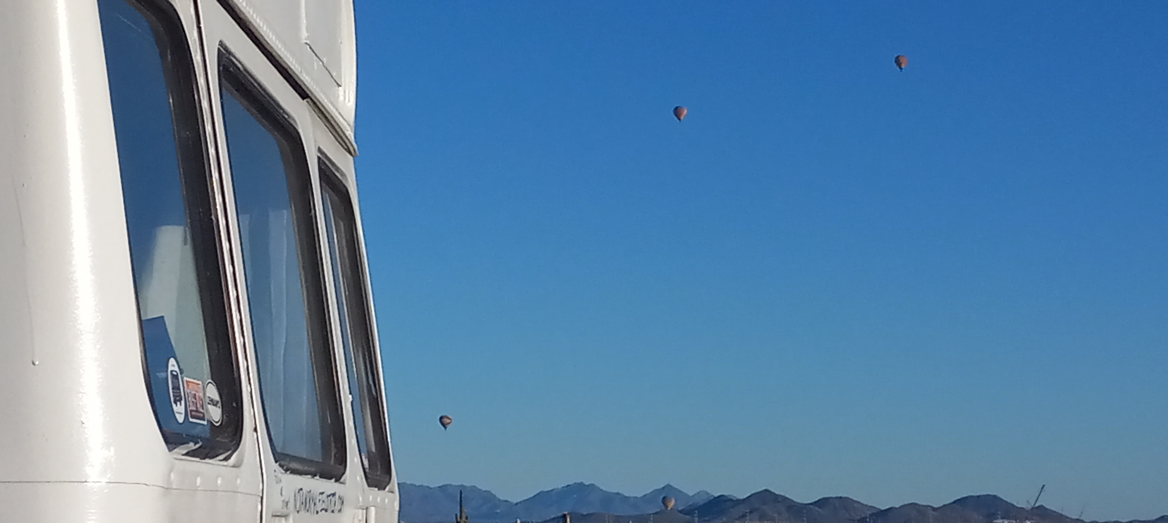Jeff has been having a blast with Hot Air Expeditions! He crews for at least one flight most days of the week. Some days he crews for a morning and an evening flight. He has an official uniform polo with the company logo on the chest and “FLIGHT CREW” on the back. With his new dessert sand-colored khakis, he looks pretty official out there chasing hot air balloons! As expected, the balloons have been taking off and landing near the bus. We got some photos of the bus with the balloons the past few days. Jeff has some more detailed photos to share soon. He will explain the flight process better then. But for now, enjoy the “glamorous” side of #buslife below!