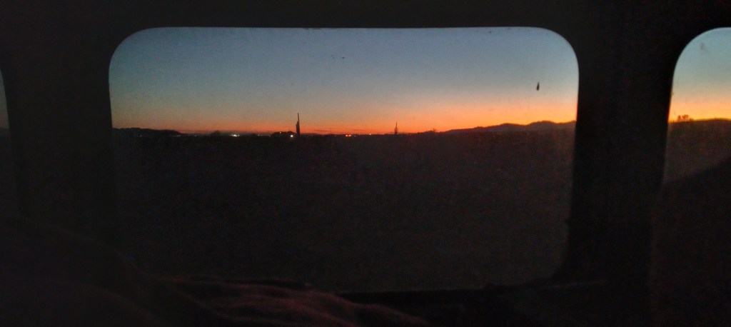 The bus is in its happy place – free in the desert! And Scarlett making sure I don’t go too far away while snapping this photo.