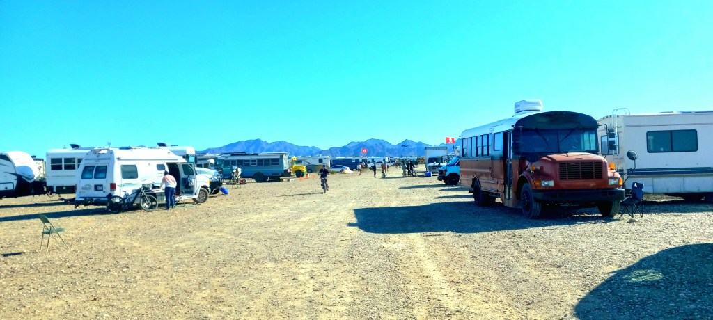 So many activities happened throughout the week, we couldn’t attend them all, but we wanted to list a few of them. There were many concerts of all different genres of music, a wood chopping contest, an impromptu nomad wedding, yoga sessions, birthday parties, and organized hikes. Vendors were making up a large chunk of the complex selling all sorts of items from their skoolies, vans, and box trucks. Some sold artwork either painted or photographed. Others sold t-shirts, handmade clothing, custom vinyl stickers, blown glass, and even delicious food. There was even a library bus where you could borrow, trade, or even pick up a book for free and a van where a guy would sharpen knives. Another of our neighbors, Donald, ran a free bike repair business from inside his bus. It was cool!