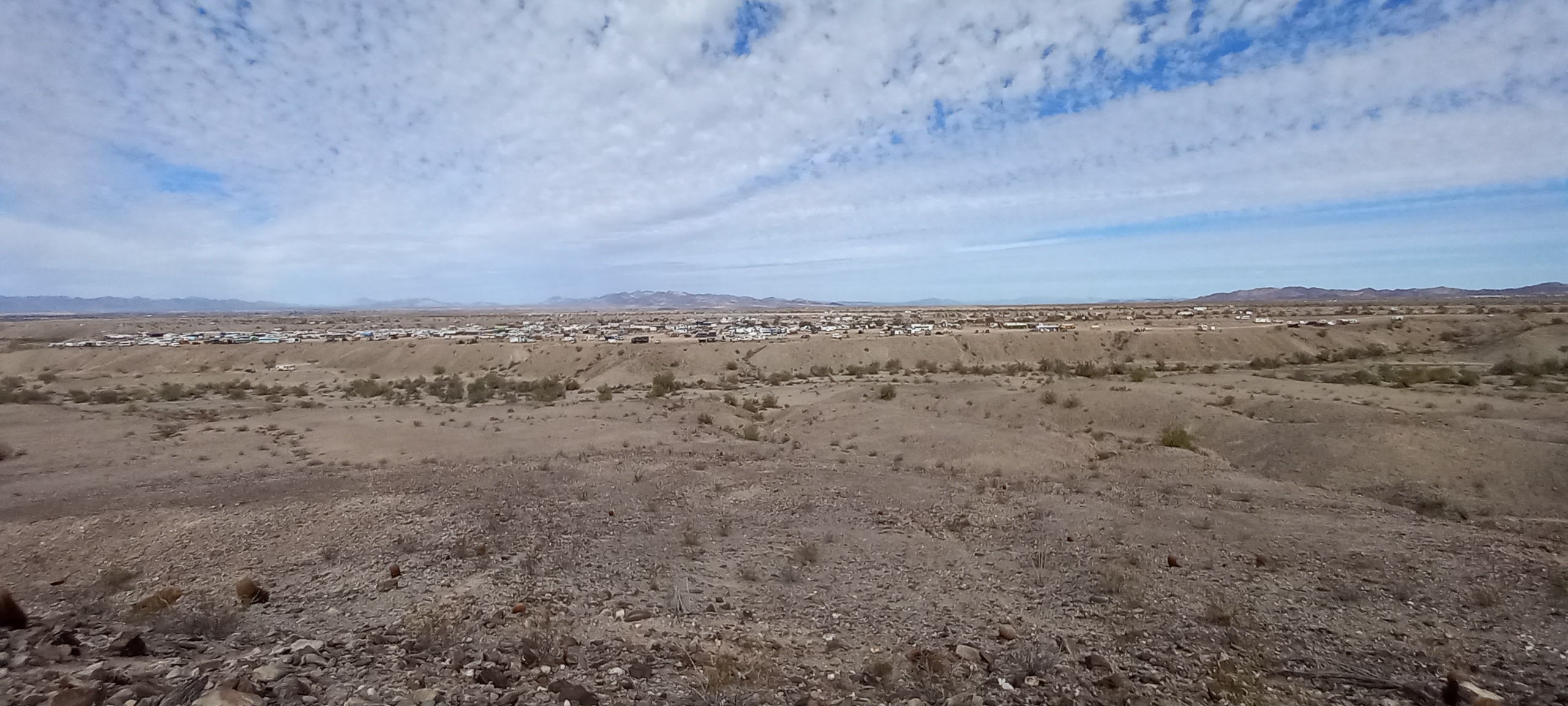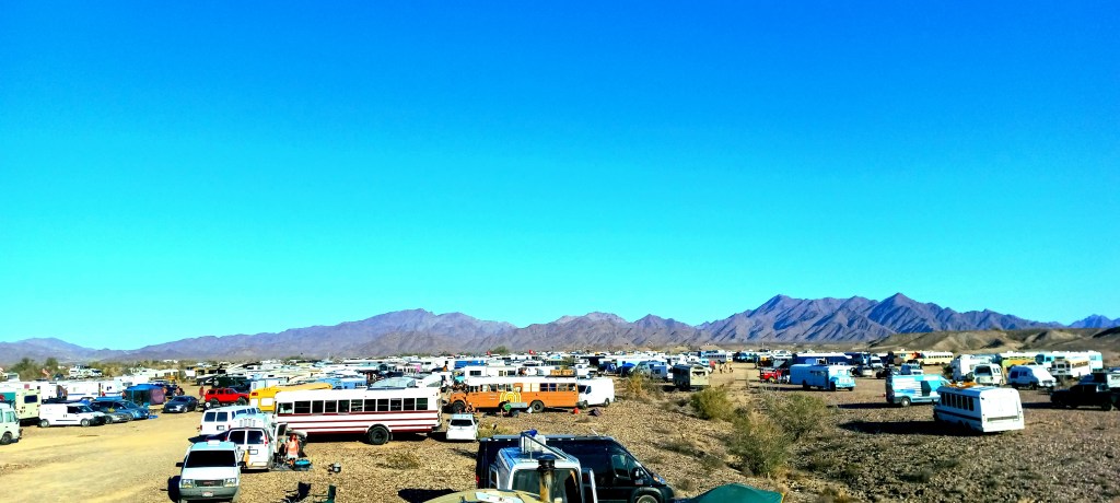 We hit the road and formed likely the largest bus convoy since the invention of the modern school bus (which was 1927, in case you were wondering). We were thrilled that the new location was actually back in Arizona, about an hour south, very near Quartzsite. We were all following the GPS apps on our phones until we started seeing road work signs alerting us that 20-some miles ahead the bridge was out and only local traffic could pass through. Ugh! We all had to turn our rigs around on a two-lane back road and find another route. Once headed the right way, we were quickly left behind as many of the other smaller and lighter busses could take the hills faster. But we eventually had others from behind us catch up and we pulled into the new location behind, as well as followed by, so many busses!