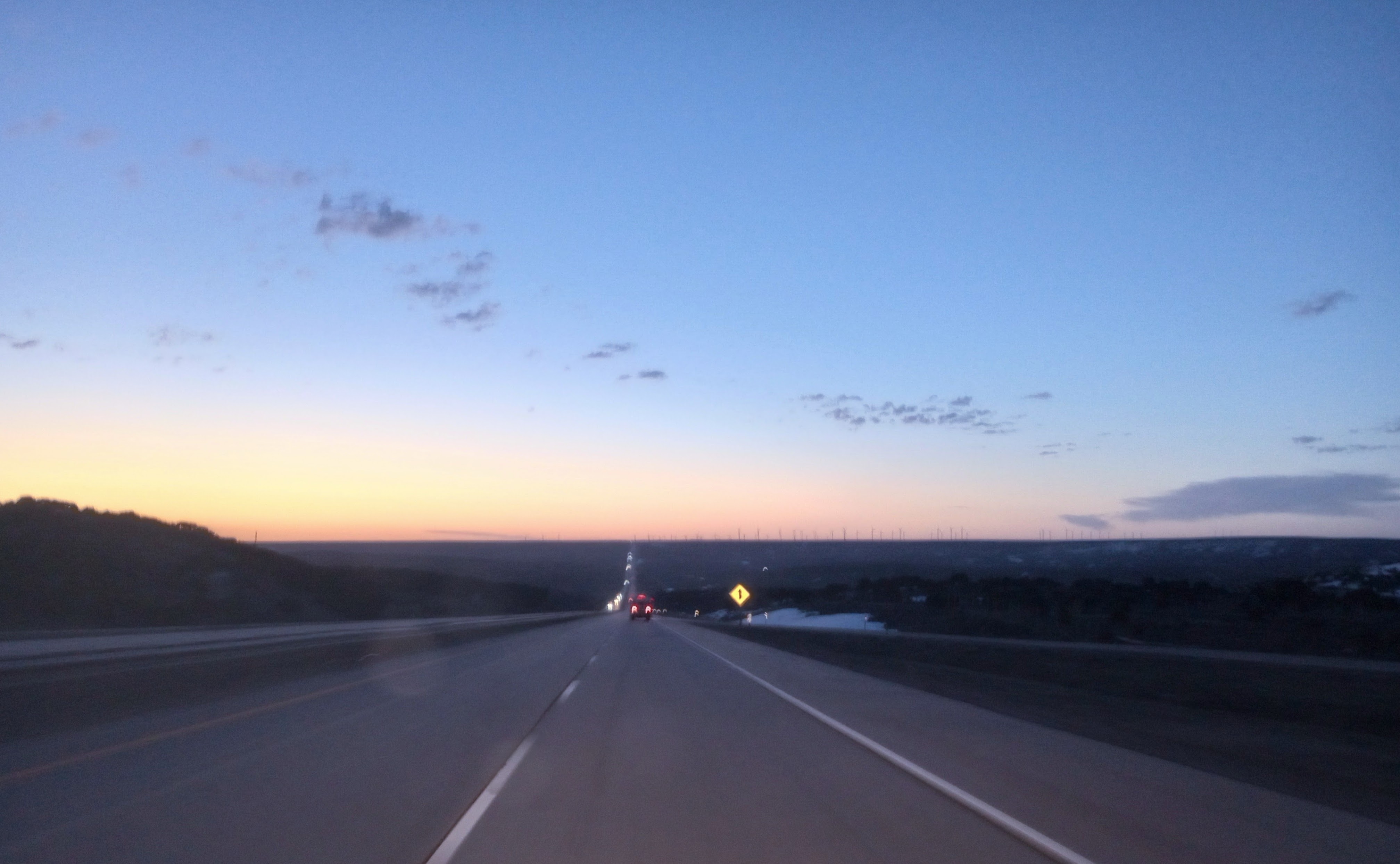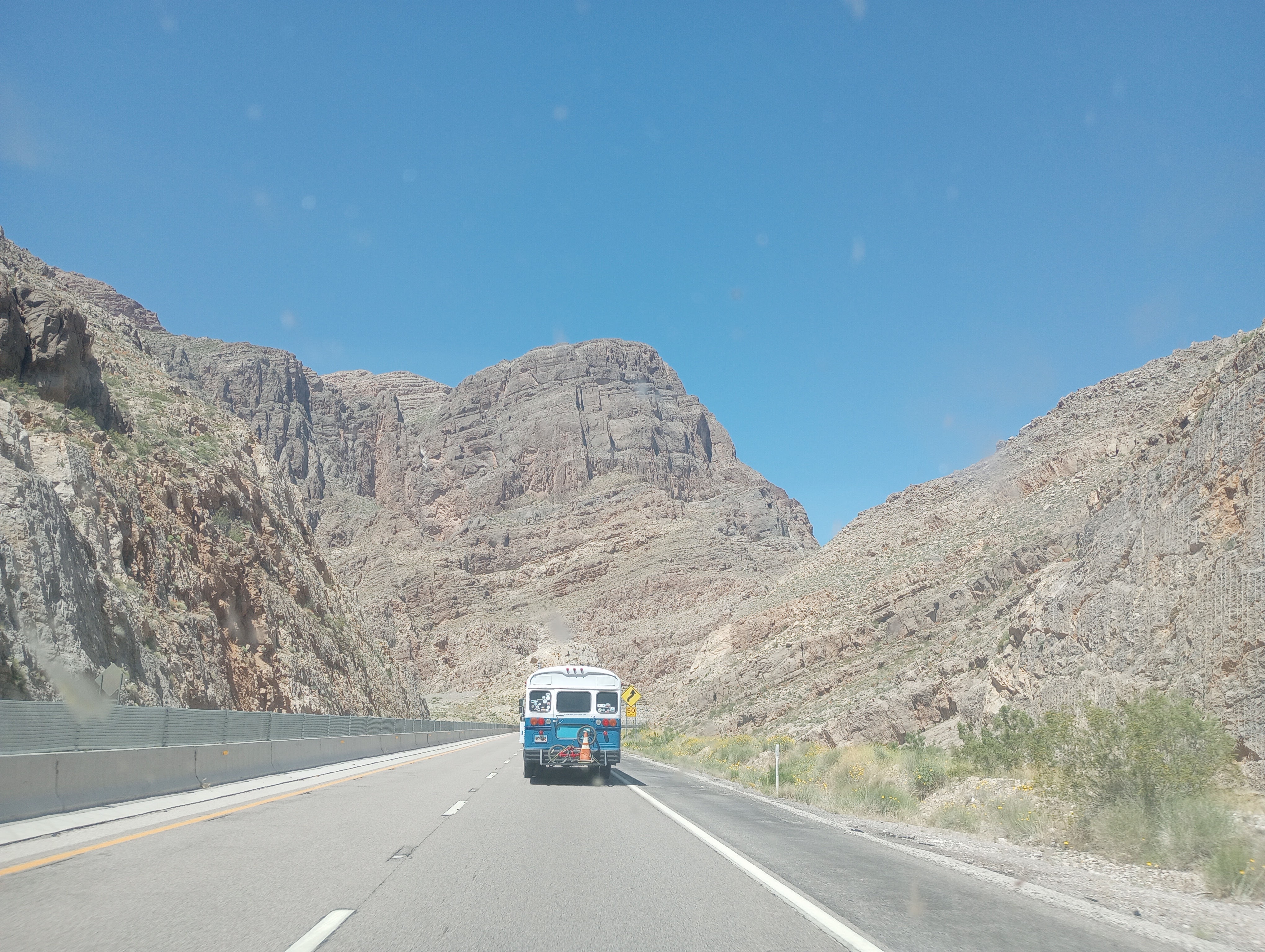 Above is the bus flying down the hill at 70 MPH attempting to get enough cold air over the engine and picking up enough speed to make it up the portion of road ahead of us called “Highway to Heaven”. It’s hard to tell in the photo, but if you look at the way the headlights of the oncoming traffic are seemingly coming straight down from the sky you will understand the moniker. The horizon to the right of the highway is littered with wind turbines as there is a constant wind all the way up there.