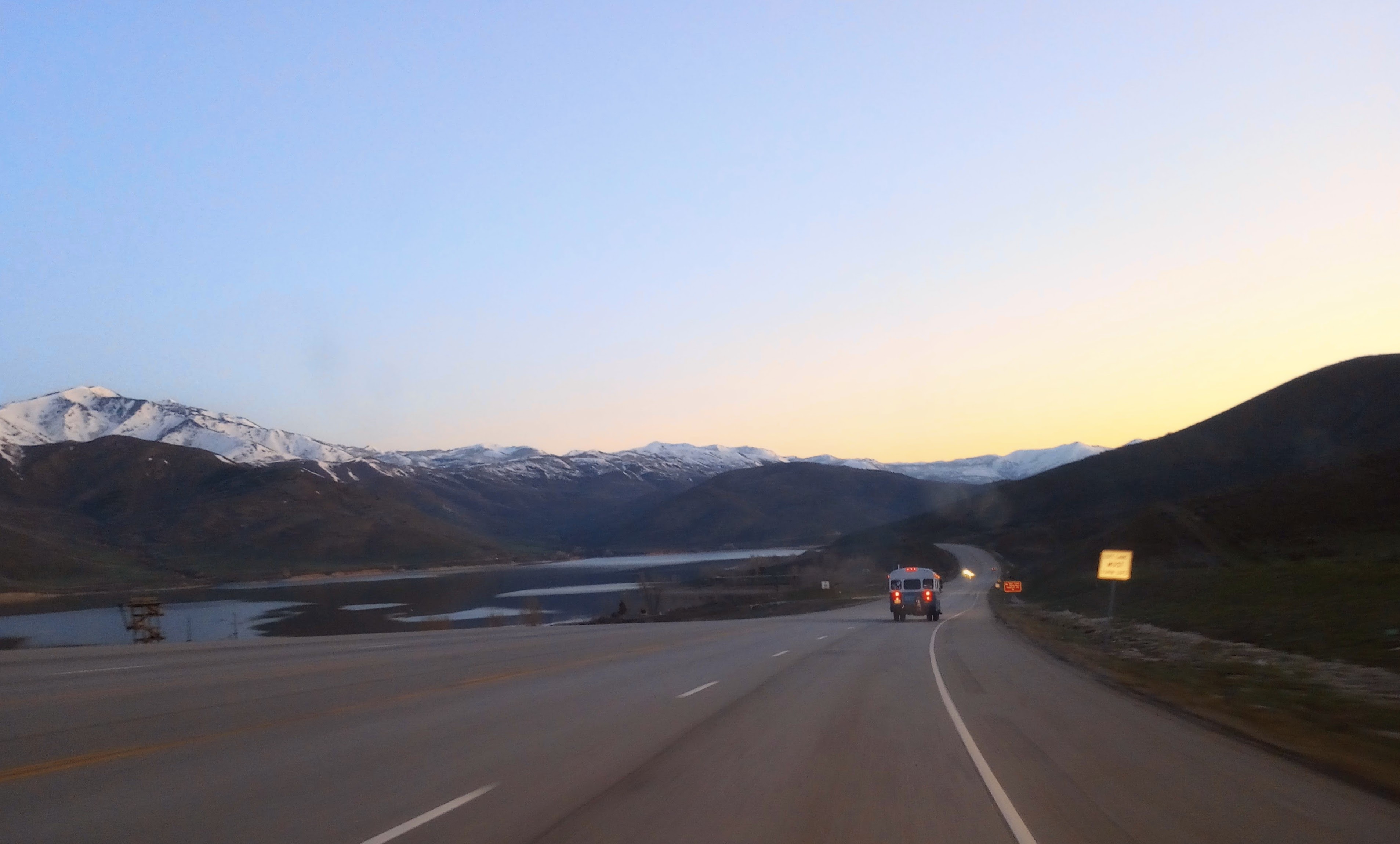 It was hard to see the gorgeous scenery of this Scenic Highway in the dead of night, but just as the sun was rising we were passing by this lake at the foot of the snow-capped mountains! With only about an hour of drivable temperatures left, we didn’t stop, but took this photo on the move to get as far as we possibly could!