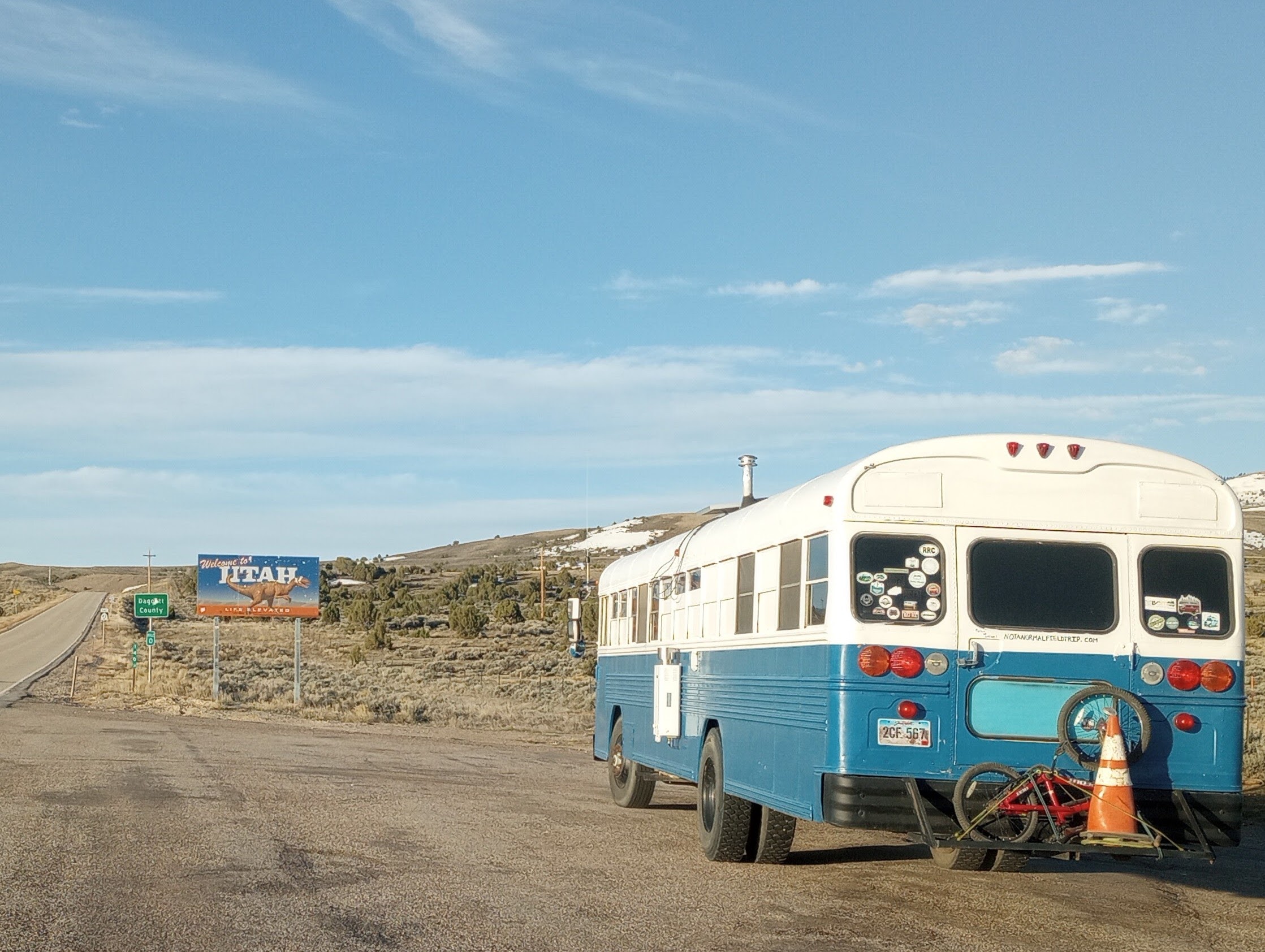 By 7AM we were crossing back into Utah and had gained enough elevation that we could push though the final couple of hours in the daylight. We stopped just briefly enough to wash all the bugs off the windshield (the bus has new windshield wipers to be safe in the rain, but we haven’t figured out the washer fluid yet) and get this Daggett County, Utah photo only 20 minutes from Rocky Ridge!!